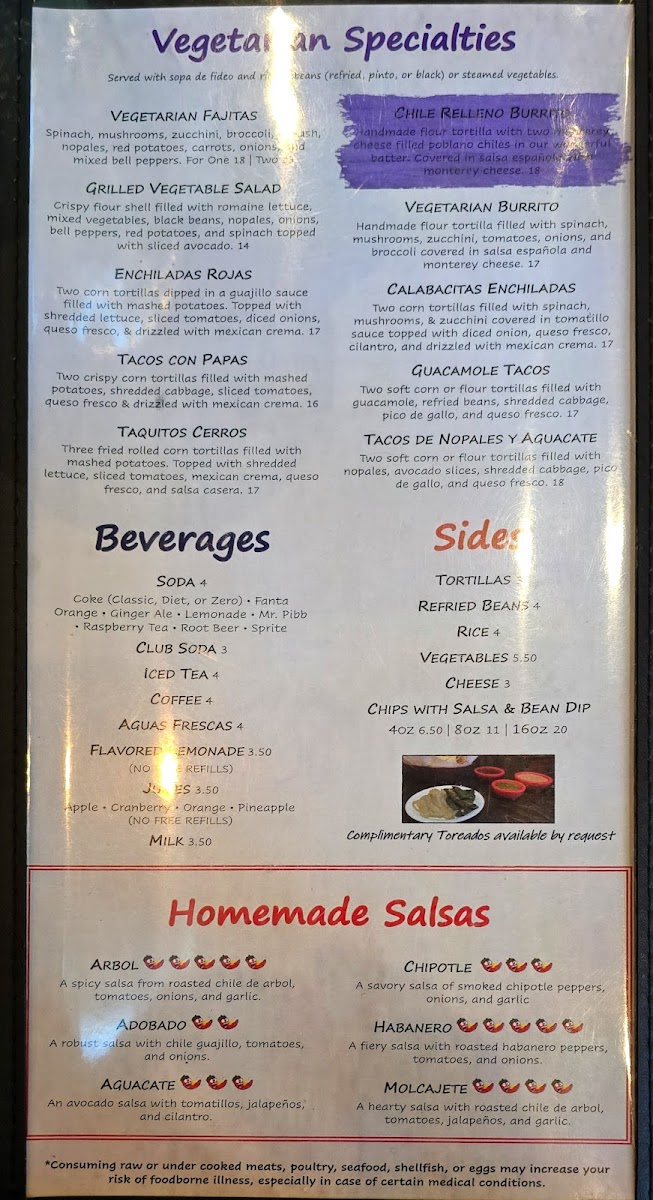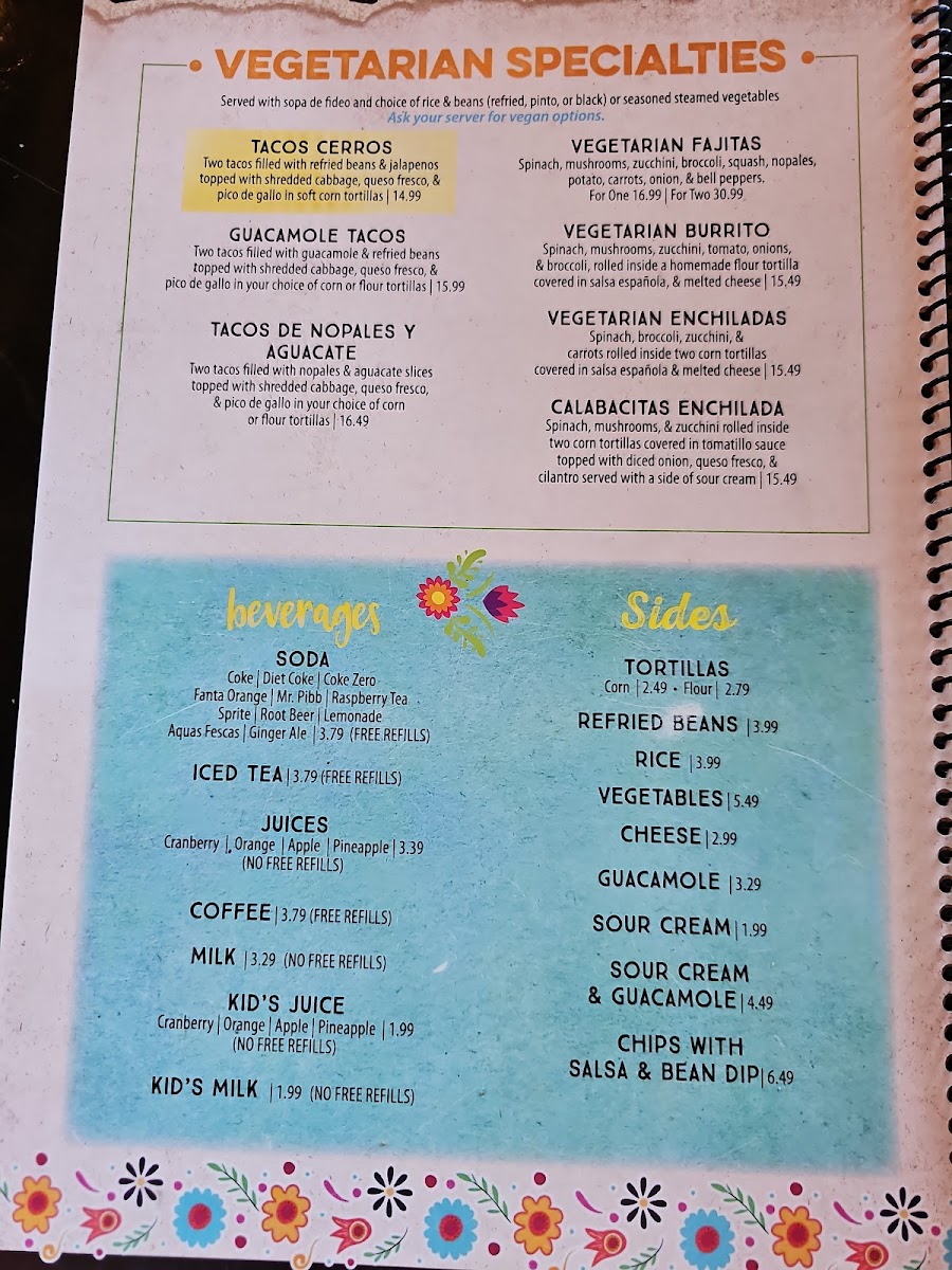 Coke, diet coke, coke zero, fanta orange, mr. Pibb, raspberry tea, sprite, root beer, lemonade, aquas frescas, ginger ale. (Free refills)